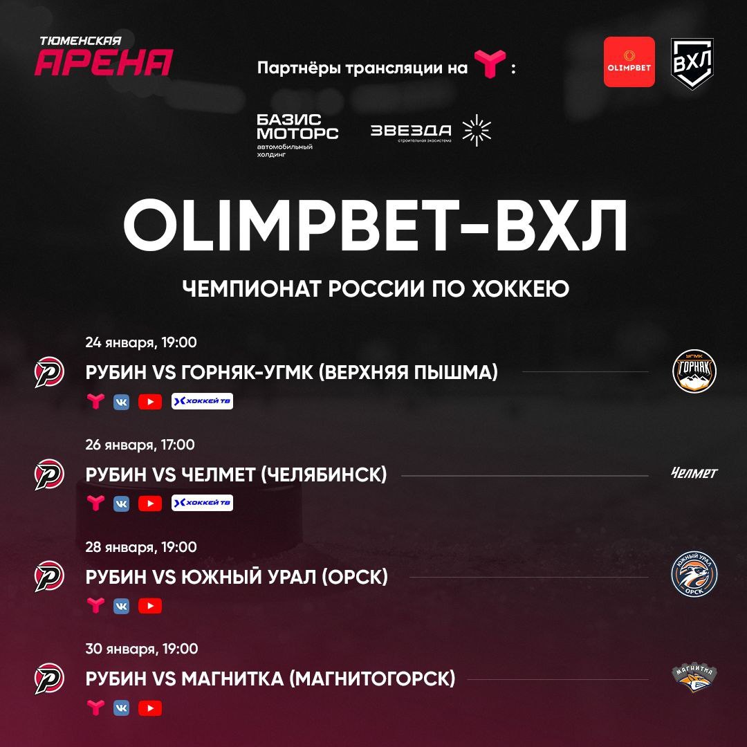 Игры «Рубина» против «Горняка-УГМК» (24.01 19:00), челябинского «Челмета» (26.01 17:00), «Южного Урала» из Орска (28.01 19:00) и «Магнтики» из Магнитогорска (30.01 19:00) вы сможете увидеть в прямом эфире на телеканале «Тюменское время» и на всех платформах ВХЛ в интернете.